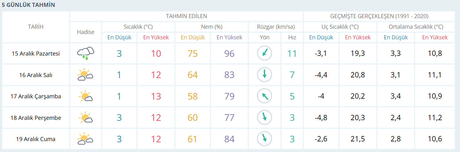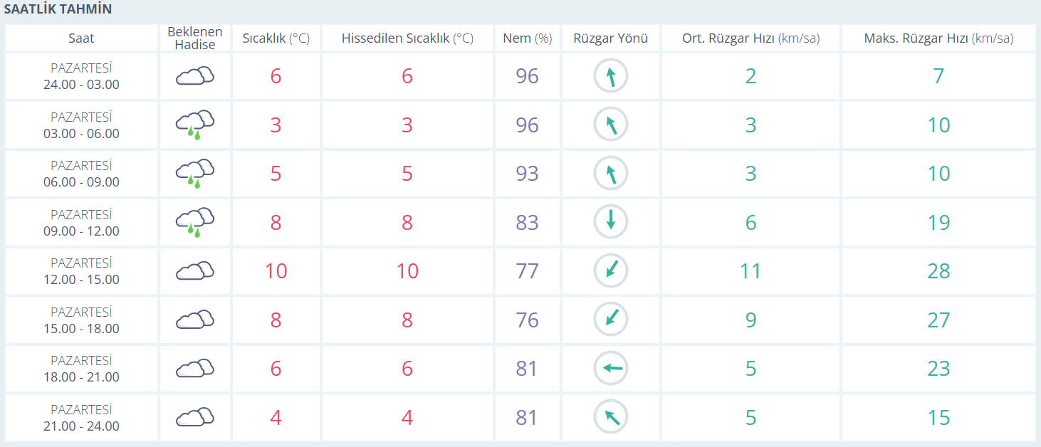 Saatlik iddialara bakıldığında, 15 Aralık Pazartesi günü gece saatlerinden itibaren yağmur bekleniyor. En düşük sıcaklık 3°C'ye kadar düşerken, sabah saatlerinde sıcaklık 5°C'ye yükselecek. Günün ilerleyen saatlerinde ise sıcaklık 10°C'ye kadar çıkacak. Nem oranı gün boyunca yüksek, %96 civarında olacak.